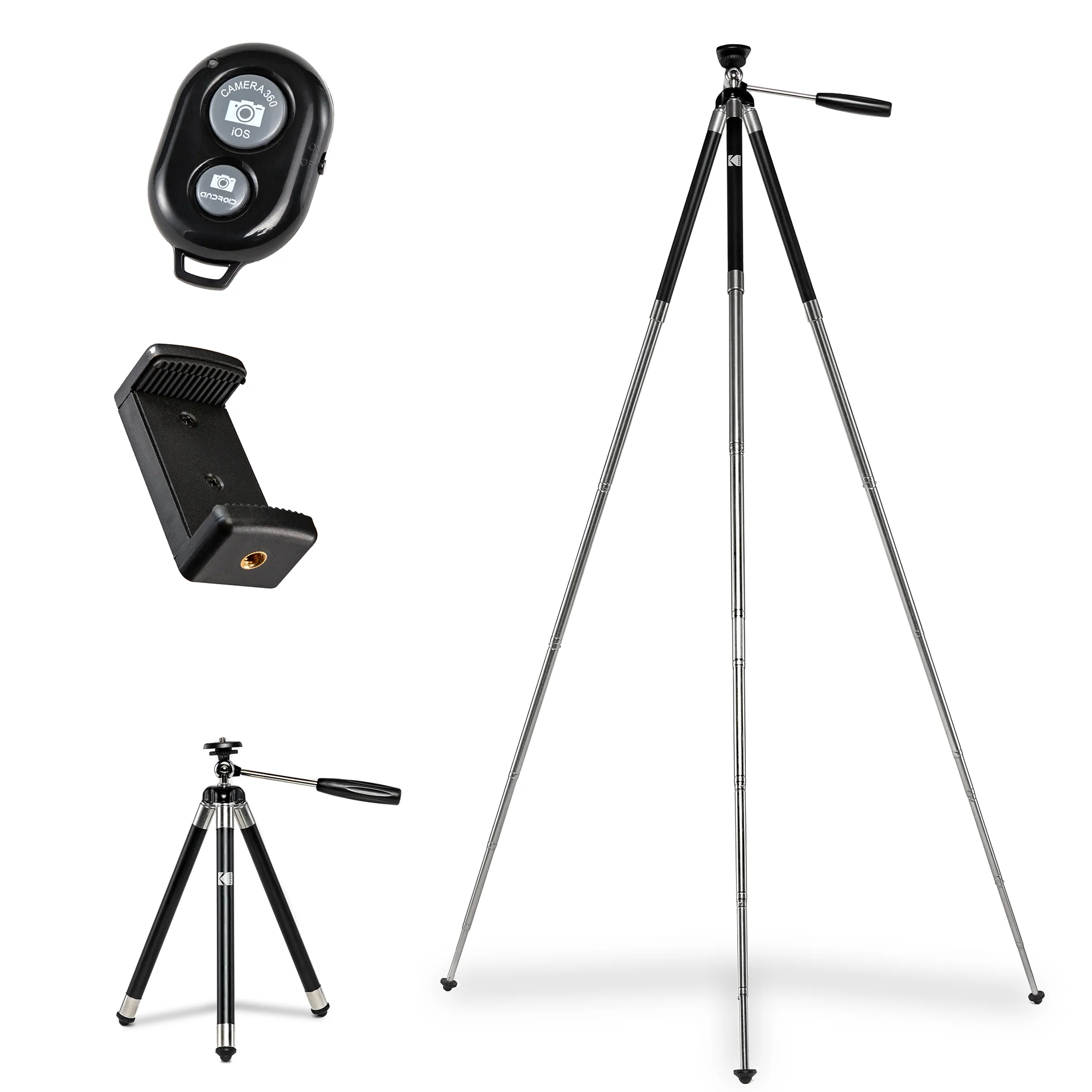 Get amazing shots with the KODAK Photo Gear Tripod with Remote 42”/106.6 cm. Set your camera up on this quality tripod or equip the included smartphone adapter to use your cellular device. Do not worry about an angle being unbalanced because with the rubber feet, you can make sure everything is flat and stable. Snap several unique shots from different heights using the adjustable leglock system. No need to even stand behind the tripod when you use the Bluetooth® remote. Stand from a distance and take several pictures with the press of a button.